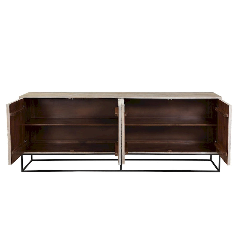 This versatile 84 inches sideboard mixes materials and textures to create a striking design. Made from solid mango wood in a light warm wash finish, it features a stunning hand-carved design on each of the four doors that open to find two built-in shelves for added storage. Sitting atop a black metal base for extra support, this sideboard is equal parts durable, functional, and stylish.